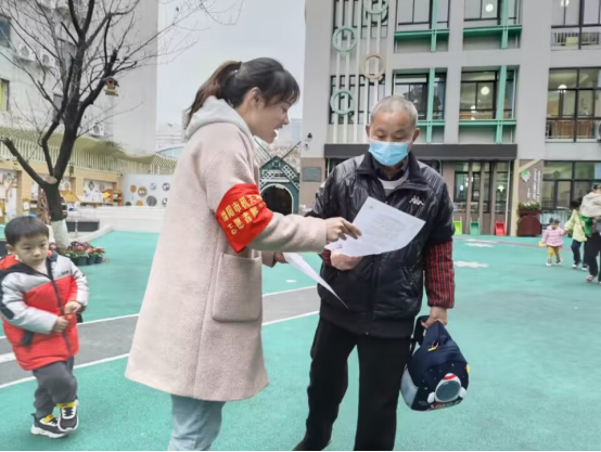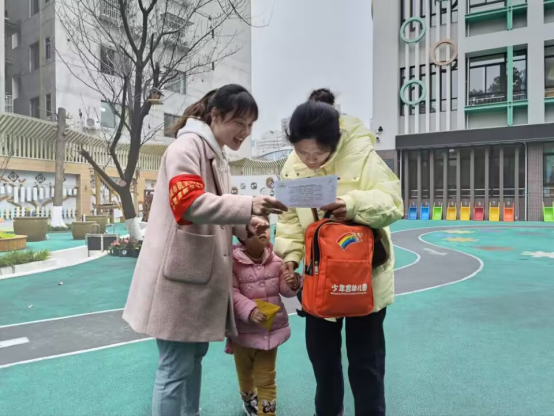 青年教师们向志愿向家长发放、讲解《家庭教育宣传语》