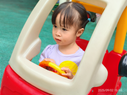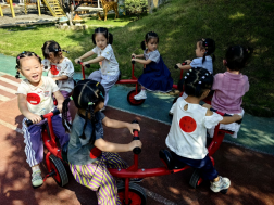 有的宝贝骑着小车“嗖……”地滑过来,享受着风在耳朵边唱歌,发出了一串串铃铛般清脆的笑声!