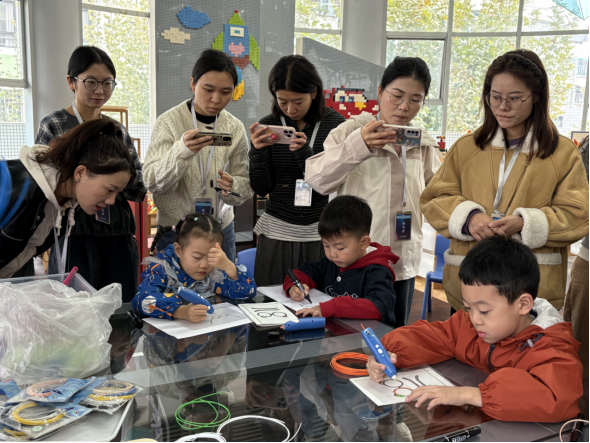 陈雅红和李琴老师共同执教3D打印项目小组活动《立体眼镜》,巧妙地将3D打印技术融入幼儿探索活动中,让孩子们在动手实践中感受科技的魅力,也为学员们理解如何在游戏情境中引导幼儿感知科技、培养创新思维提供了鲜活范例。随后,陈老师以《AI赋能幼儿园教育新探》为题,深入剖析了人工智能背景下幼儿教师应具备的信息素养、数字思维与教学创新能力,启发学员们深入思考技术赋能教育的深层价值与实践路径。