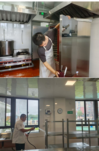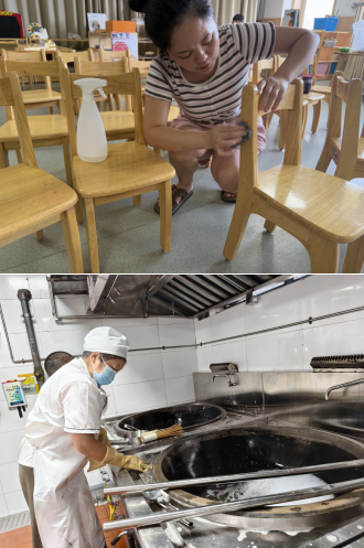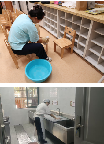 老师们细心打扫每一个角落、认真检查每一处细节,只为给孩子营造更安全、洁净、温馨的生活空间;厨房员工全力清洁消毒餐厨环境、严格规范操作流程,用心守护师生“舌尖上的健康”。
